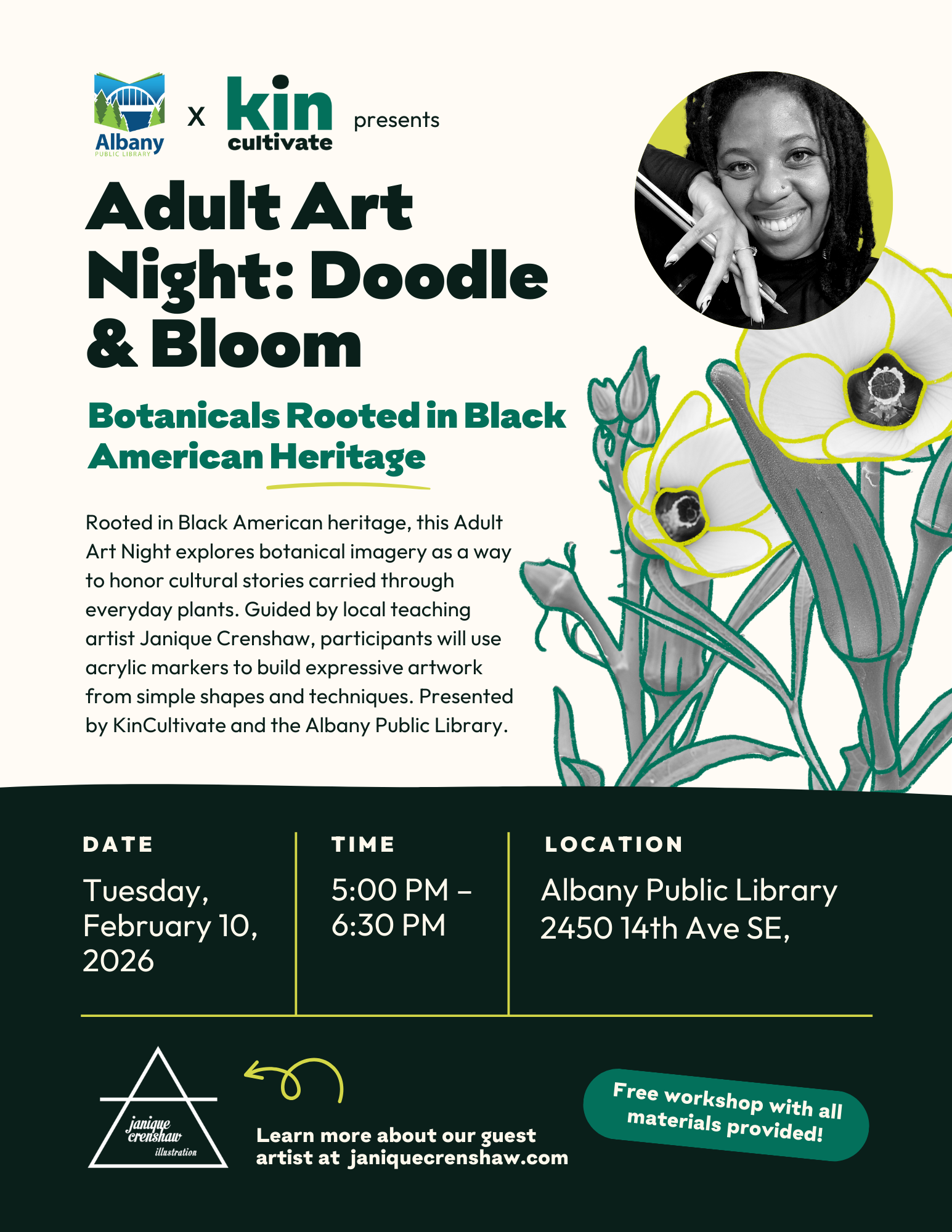 Settle into an evening of art-making that honors Black American heritage through creativity and shared learning. This Adult Art Night is led by local teaching artist Janique Crenshaw, in partnership with KinCultivate and the Albany Public Library. Using acrylic markers, participants will learn a small set of approachable shapes and techniques, then build them into expressive botanical imagery connected to the cultural stories and traditions carried through everyday plants. The workshop balances guided instruction with personal choice, welcoming beginners while remaining engaging for those who enjoy drawing. The focus is on learning tangible skills, honoring heritage beyond a single month, and creating artwork that feels grounded and personal. All materials are provided. Space is limited, and materials are available on a first-come, first-served basis.